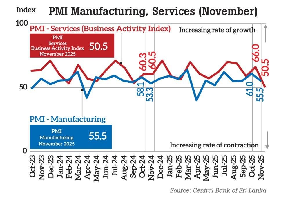 Sri Lanka’s manufacturing and services sectors remained in expansionary territory in November, though growth moderated from October, according to the Central Bank of Sri Lanka’s Purchasing Managers’ Index.